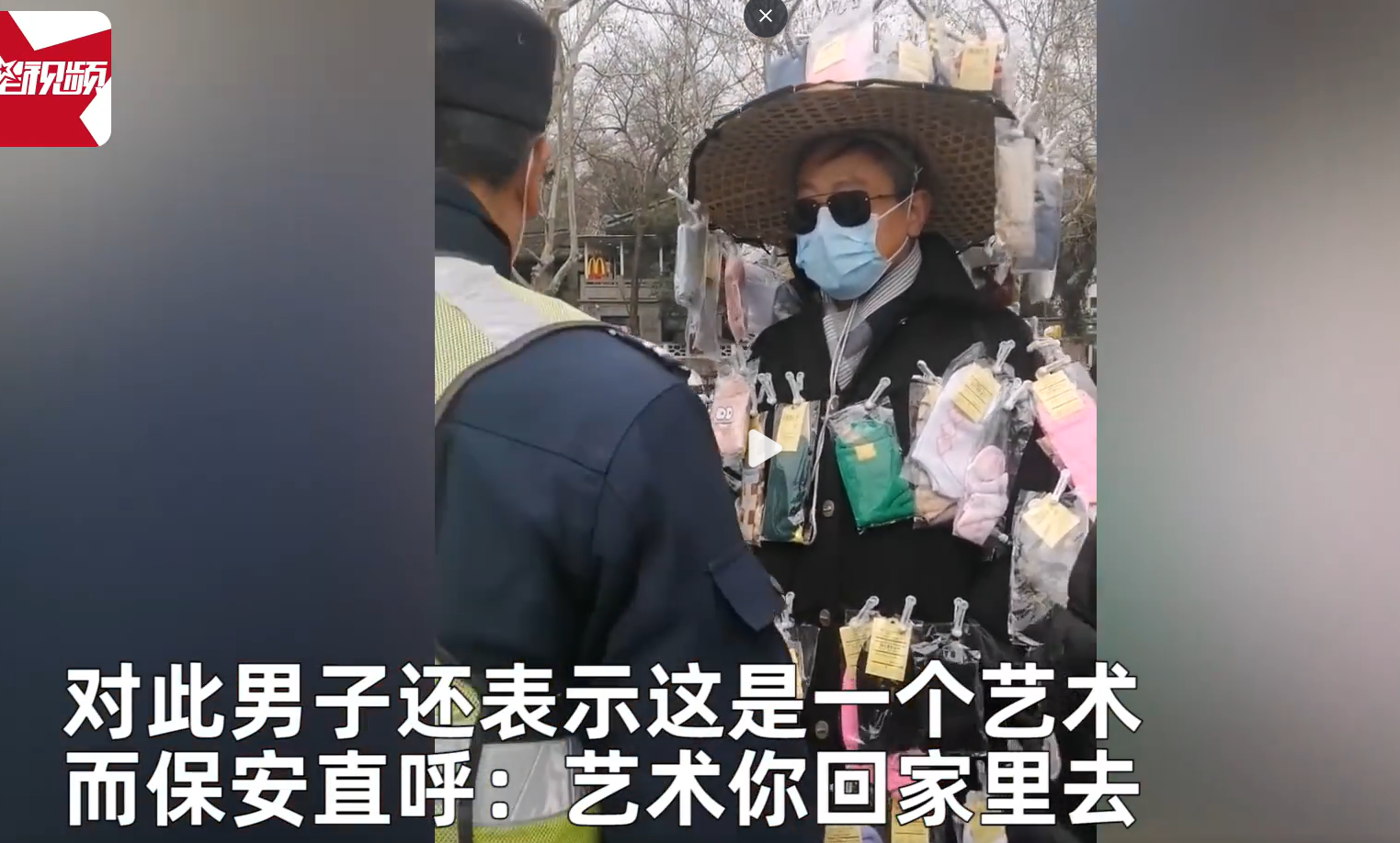 2月21日,浙江杭州。一位大爷全身挂满袜子,毫不避讳地走进景区,随后景区保安上前进行阻拦,表示男子穿成这样不能进,男子辩称:我不是来摆摊卖的,这是我的衣服。对此男子还表示:这是一个艺术。而保安直呼:艺术你回家里去。有网友表示:保安也管得太多了,不让进没道理。也有网友认为:保安做得对,他这是变相营销。