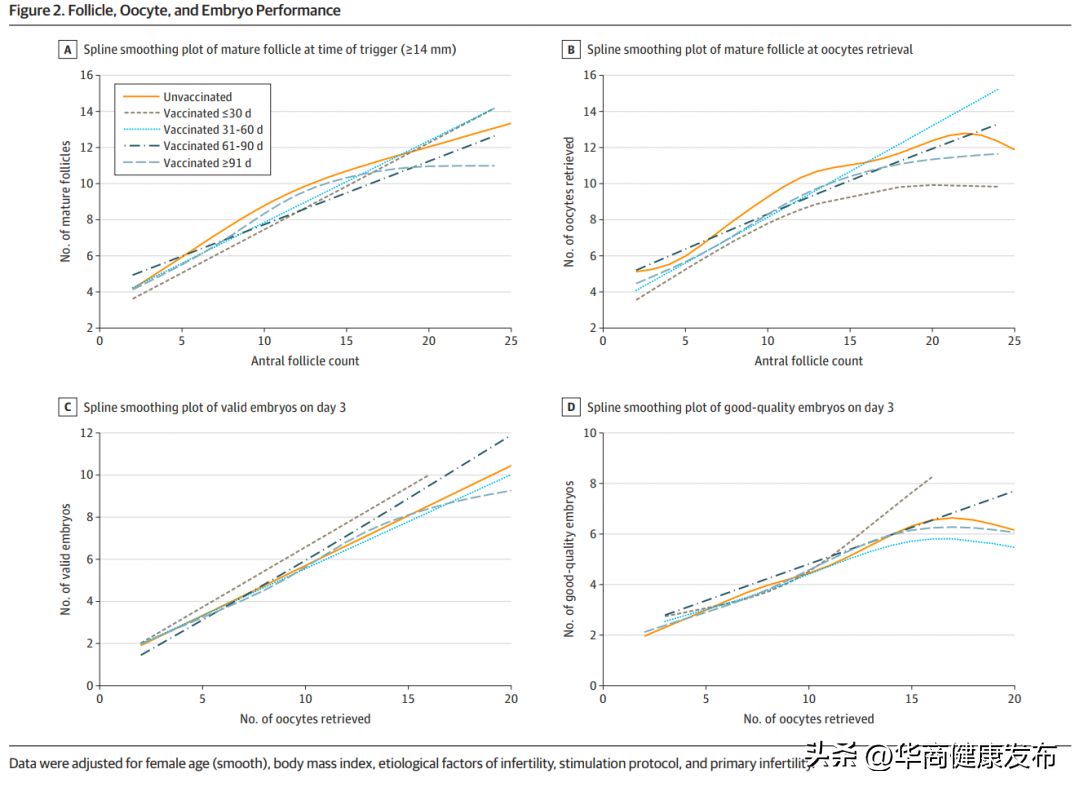 新冠肺炎仍在全球肆虐,疫苗接种刻不容缓。然而对于备孕期的妇女,尤其是准备辅助生殖技术(试管婴儿)的女性来说,是否需要因接种新冠病毒疫苗而延迟怀孕计划仍然没有明确的定论,主要原因就是缺乏足够的人群数据。随着大规模新冠疫苗接种,师娟子教授团队开展深入研究,共调查7934名试管婴儿患者,并根据他们接种新冠疫苗与体外受精的间隔分组(≤30天、31-60天、61-90天和≥91天)。结果发现不同疫苗接种时间对成熟卵泡、获卵数、第三天胚胎数及优胚数没有显著影响。