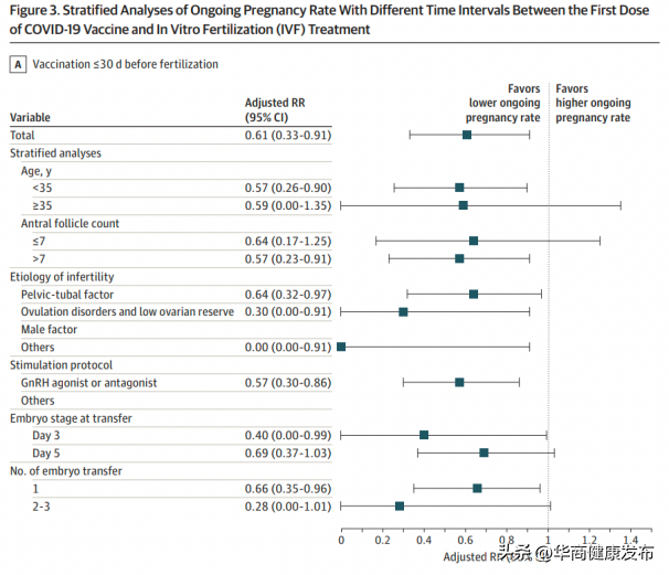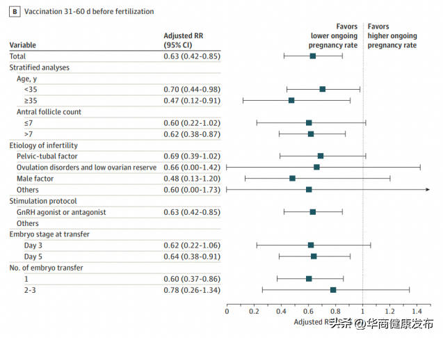 在之后的新鲜胚胎移植中,持续临床妊娠率分别是34.3%(接种≤30天)、36.2%(接种31-60天)、51.4%(接种61-90天)、56.3%(接种≥91天),60.3%(未接种疫苗组)。经过多因素模型校正后,疫苗接种≤30天和31-60天的持续临床妊娠率仍然显著下降(,95%;,95%)。生化妊娠率和临床妊娠率也有类似的变化趋势,即疫苗接种时间低于60天的妊娠率低,超过60天的妊娠率不受影响。
