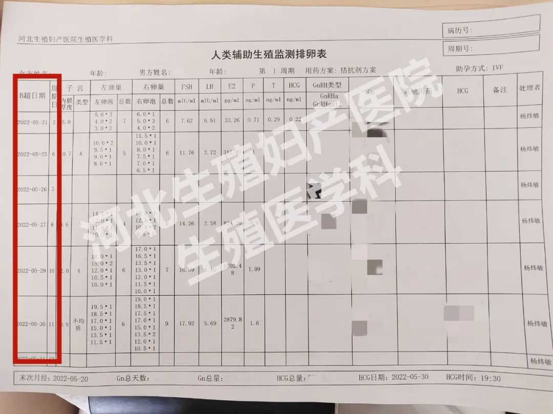 促排卵过程中,需要隔几天就来医院“报道”,所以表格设置做B超日期和月经周期日,前后进行对照比较,能更准确的把握卵泡的发育变化。