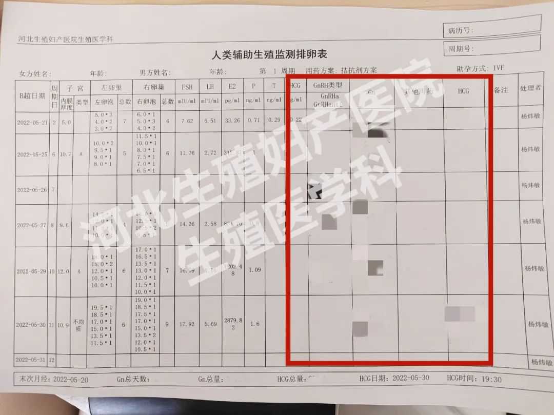 监卵表正面第1行是患者夫妻姓名、年龄、促排周期次数(在我科第几次促排)和本周期所用促排方案。