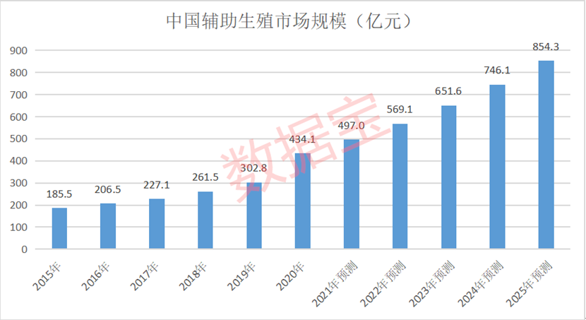 伴随着中国不孕率上升、不孕夫妻数量增加及接受试管婴儿意愿增强等因素影响,头豹研究院预计整体辅助生殖行业市场规模将持续快速增长,到2025年中国辅助生殖行业市场规模将增长至854.3亿元,年复合增长率稳定在14.5%。