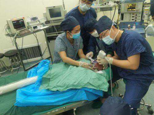 3月17日,眼科刘思伟教授和程育宏医师共同为该例“珍贵儿”行双眼玻璃体腔注药术,将药物雷珠单抗注入宝宝眼内。虽然术程较短,但因婴幼儿眼球较小且眼球壁较软,发育不成熟的特殊解剖结构,稍有不慎就会对宝宝眼球造成进一步的损害,而且中途宝宝的氧饱和度迅速下降,面部皮肤发紫,当即决定加深麻醉,增加吸氧量,最终,手术在医生的精准操作及默契配合下顺利结束。